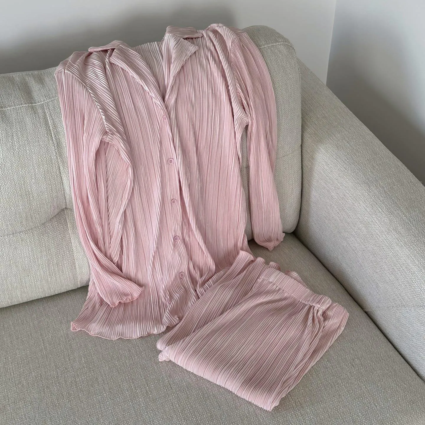 Her har du settet som redder enhver kleskrise. Plissé-stoffet ser eksklusivt ut, men føles like behagelig som koseklær. Bruk delene sammen for en gjennomført look, eller hver for seg. Klassisk, enkelt og utrolig anvendelig. Like perfekt til en rolig hjemmekveld som til en lunsj ute.